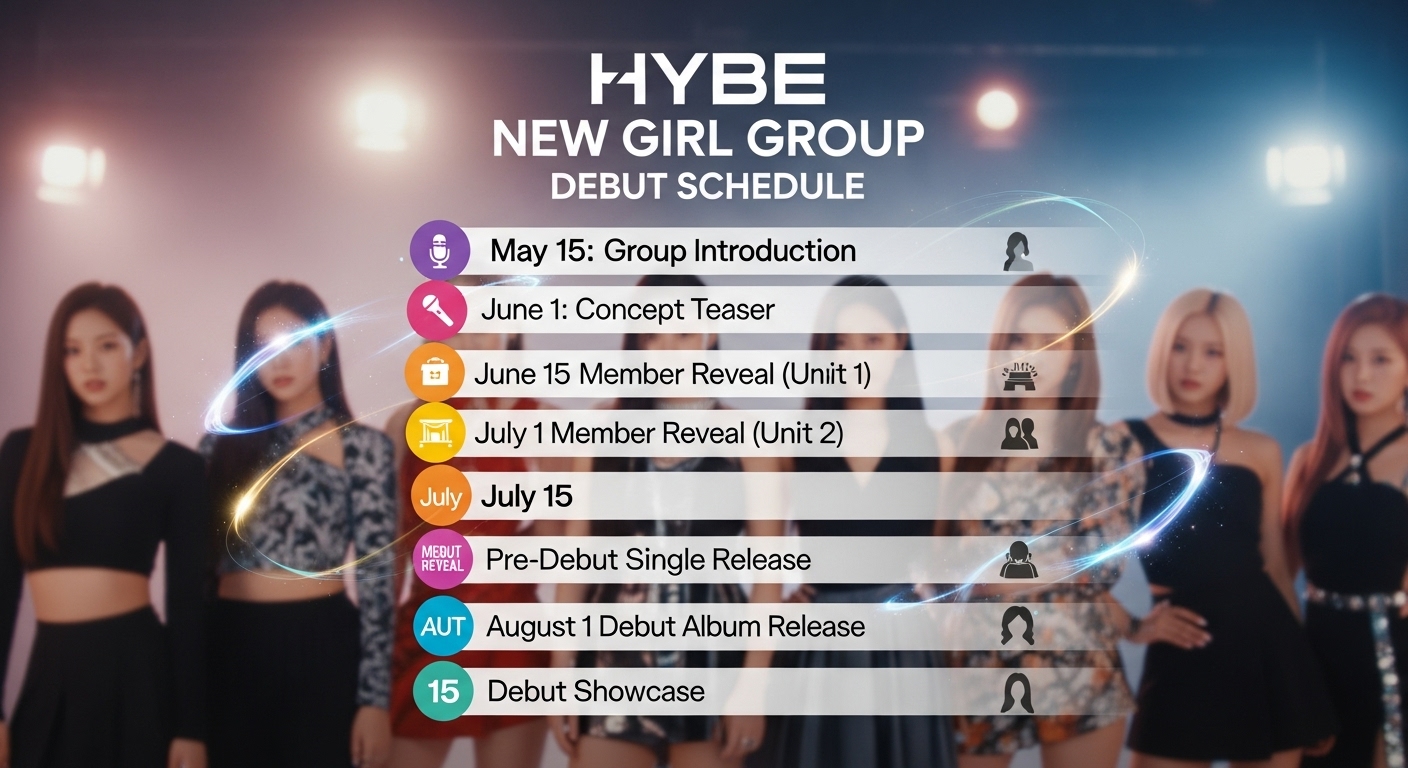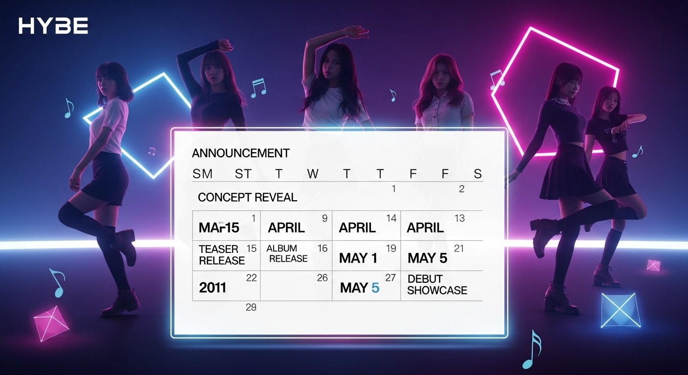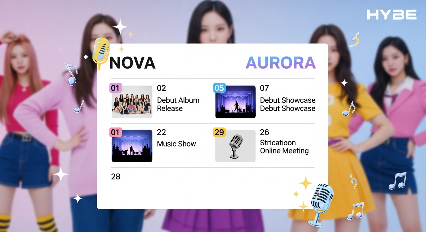 하이브 산하 각 레이블별 신인 걸그룹 데뷔 예정일과 주요 활동 계획을 정리한 표입니다. 정확한 날짜는 공식 발표 후 업데이트됩니다.